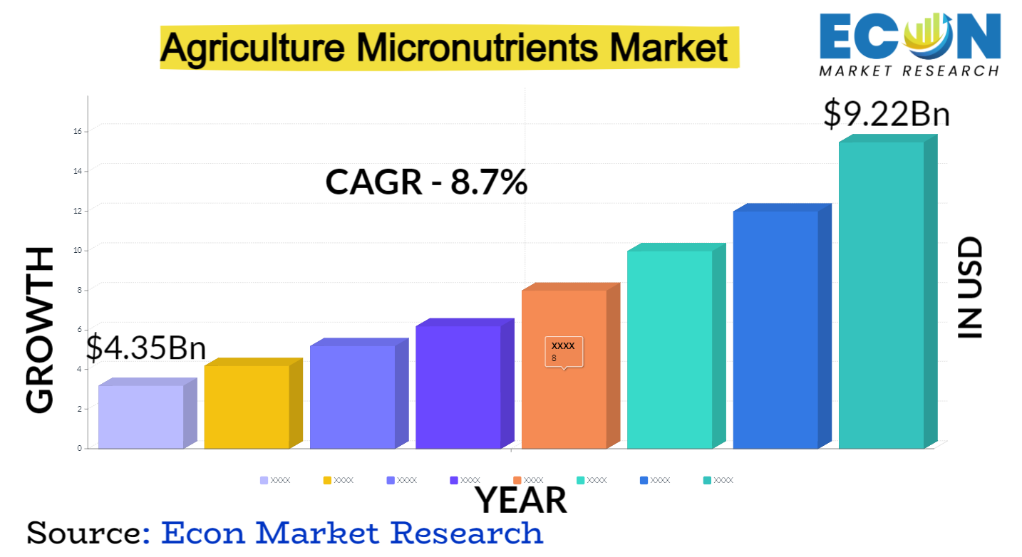 The Global Agriculture Micronutrients Market was valued at USD 4.35 billion in 2022 and is estimated to reach approximately USD 9.22 billion by 2031, at a CAGR of 8.7% from 2023 to 2031.
