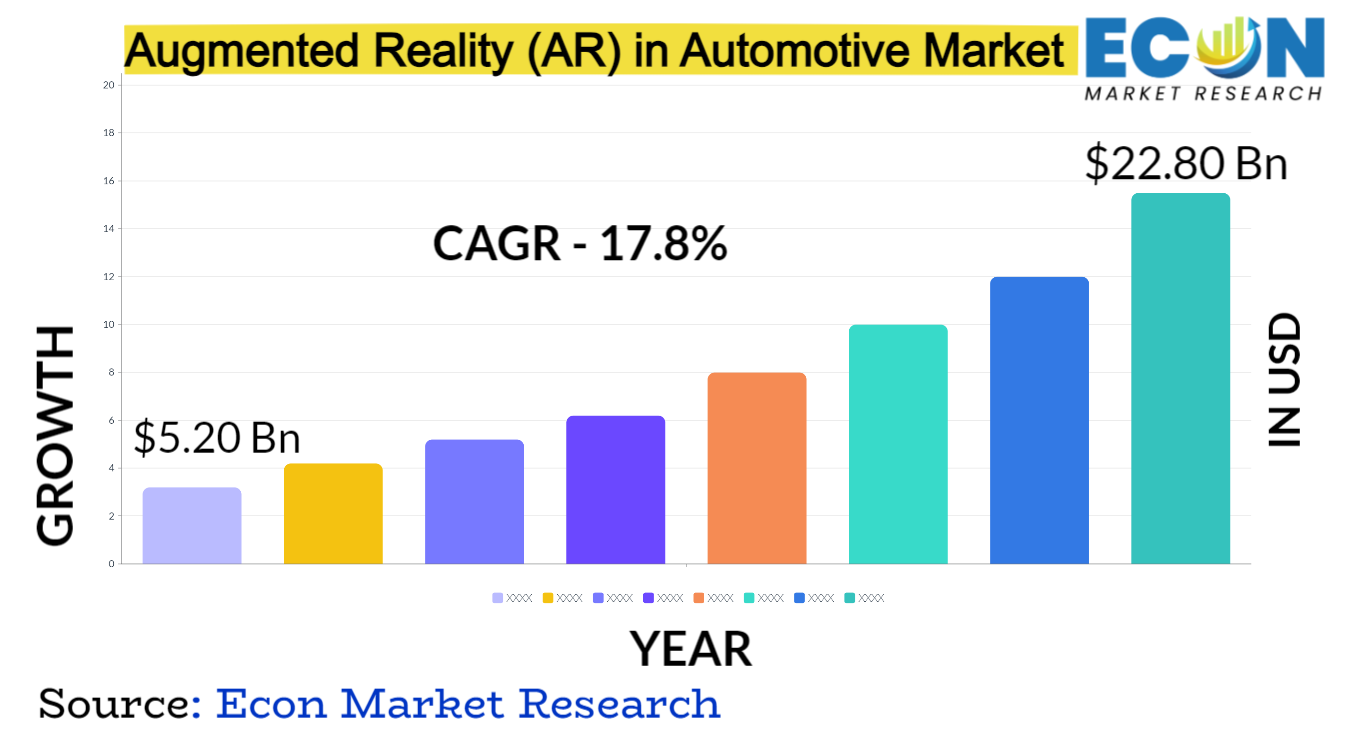 The Augmented Reality in Automotive Market was valued at USD 5.20 billion in 2022 and is estimated to reach approximately USD 22.80 billion by 2031, at a CAGR of 17.8% from 2023 to 2031.