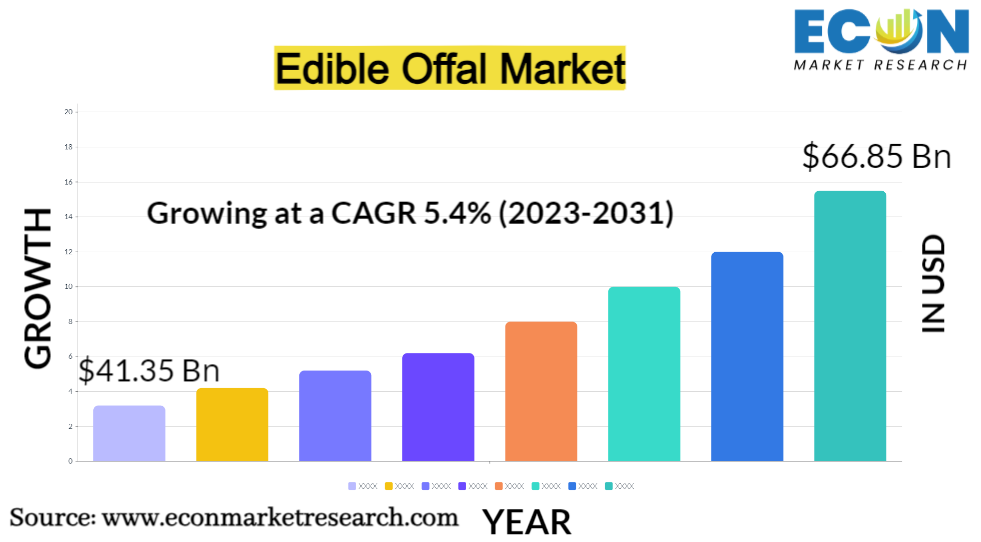The Edible Offal Market was valued at USD 41.35 billion in 2022 and is estimated to reach approximately USD 66.85 billion by 2031, at a CAGR of 5.4% from 2023 to 2031.