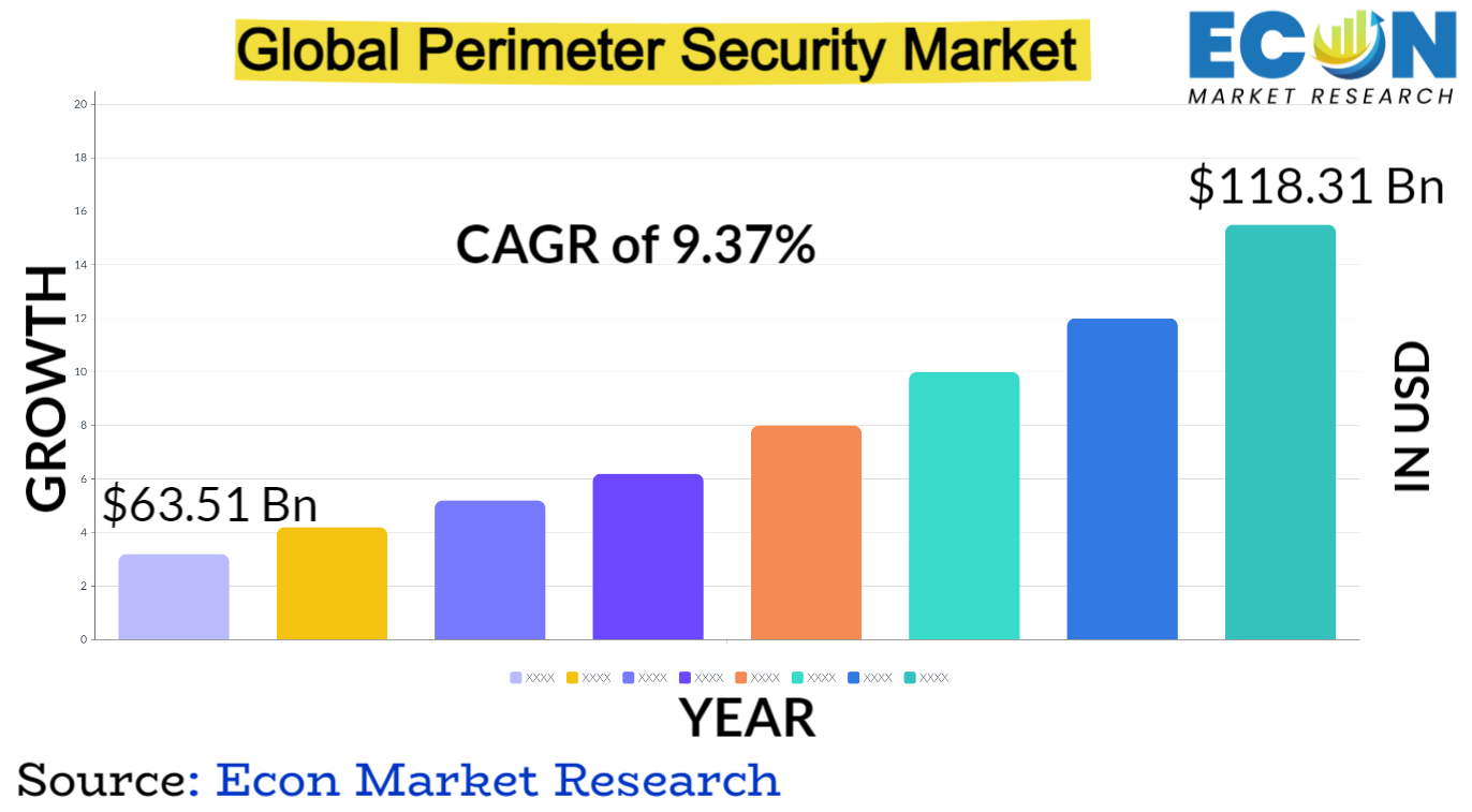 The Perimeter Security Market was valued at USD 63.51 billion in 2022 and is estimated to reach approximately USD 118.31 billion by 2031, at a CAGR of 9.37% from 2023 to 2031.
