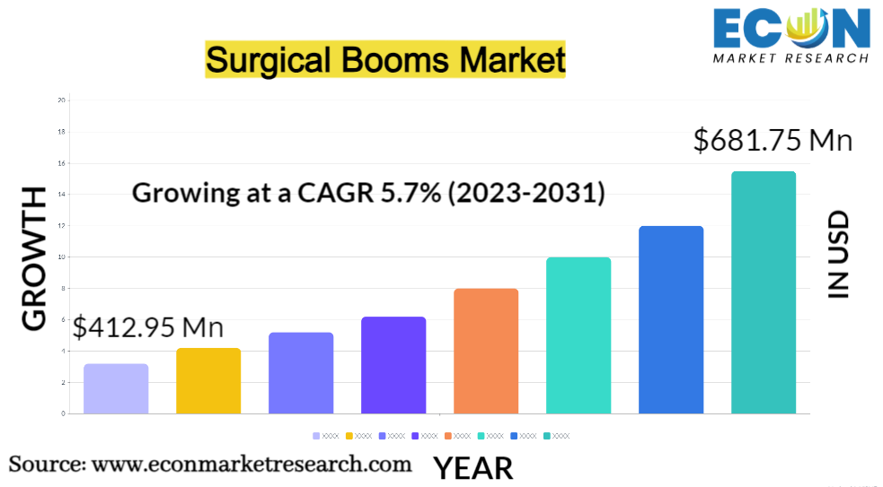 The Global Surgical Booms Market was valued at USD 412.95 million in 2022 and is estimated to reach approximately USD 681.75 million by 2031, at a CAGR of 5.7% from 2023 to 2031.