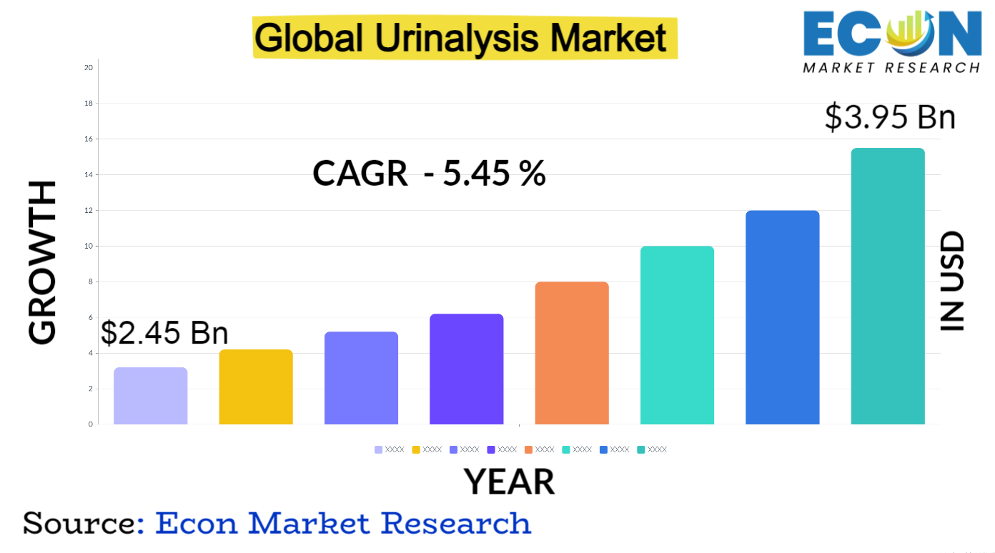Global Urinalysis market is predicted to reach approximately USD 3.95 billion by 2032, at a CAGR of 5.45% from 2024 to 2032.